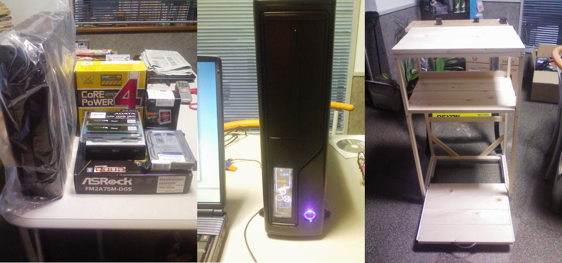 連休 2013年2月6日 kamikiriya_master コメントする 連休は雪かきに行く予定だったのに、「業者に頼んだので来なくていいよ」と言われたので、前から奥様に頼まれていたワゴンを作りました。 丁度制作を頼まれたPCも来たし、注文はごみ箱を入れられるようにスライド式にと、自作PCはスリムなPCをと有意義な連休でした。